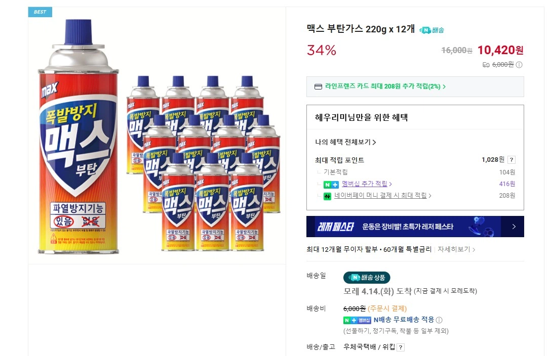 [네이버] 맥스 부탄가스 220g 12개 (10,420원 / 네멤무배)