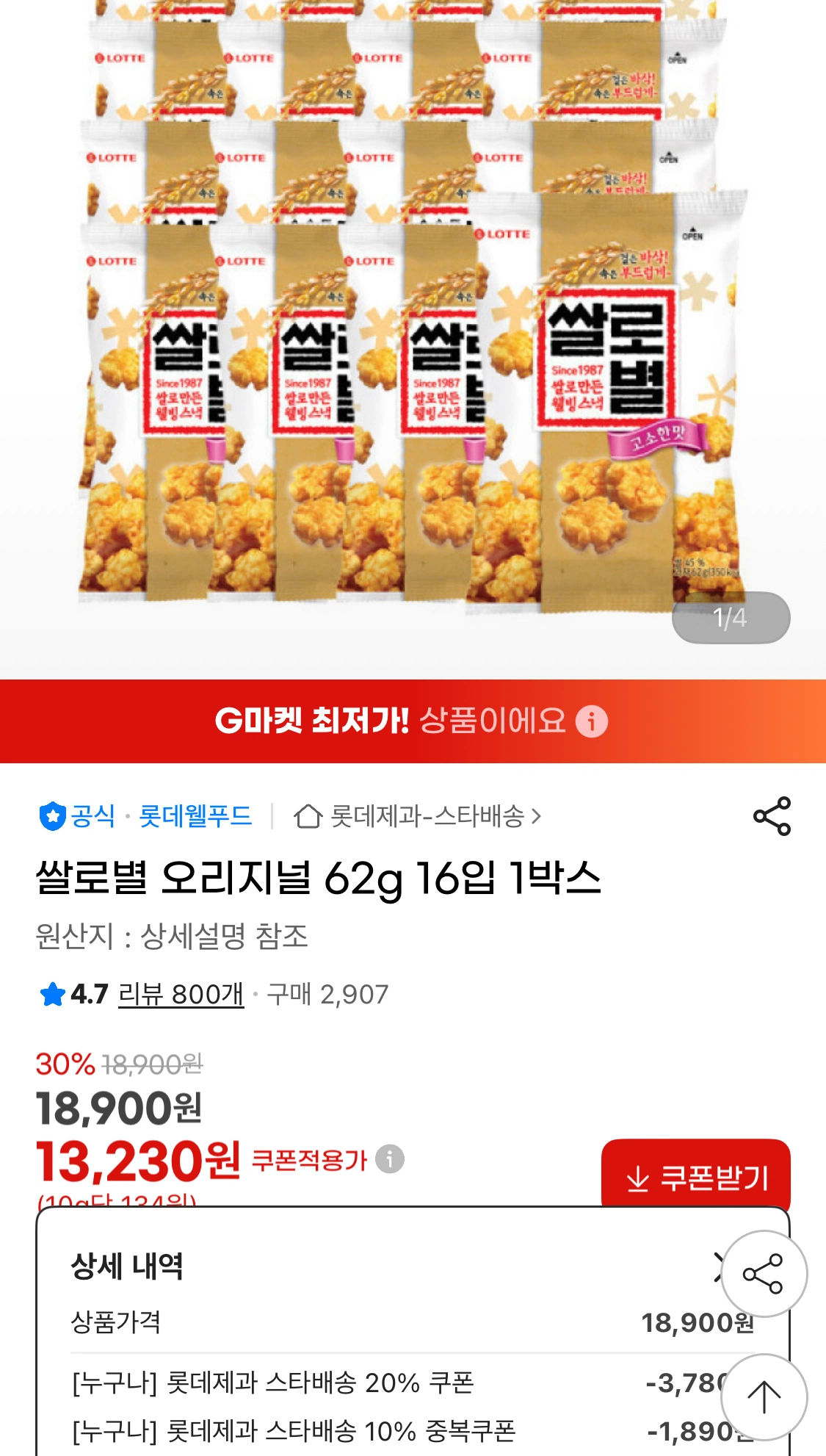 [지마켓] 쌀로별 오리지널 62g 16입 1박스 (13,230원/무료)