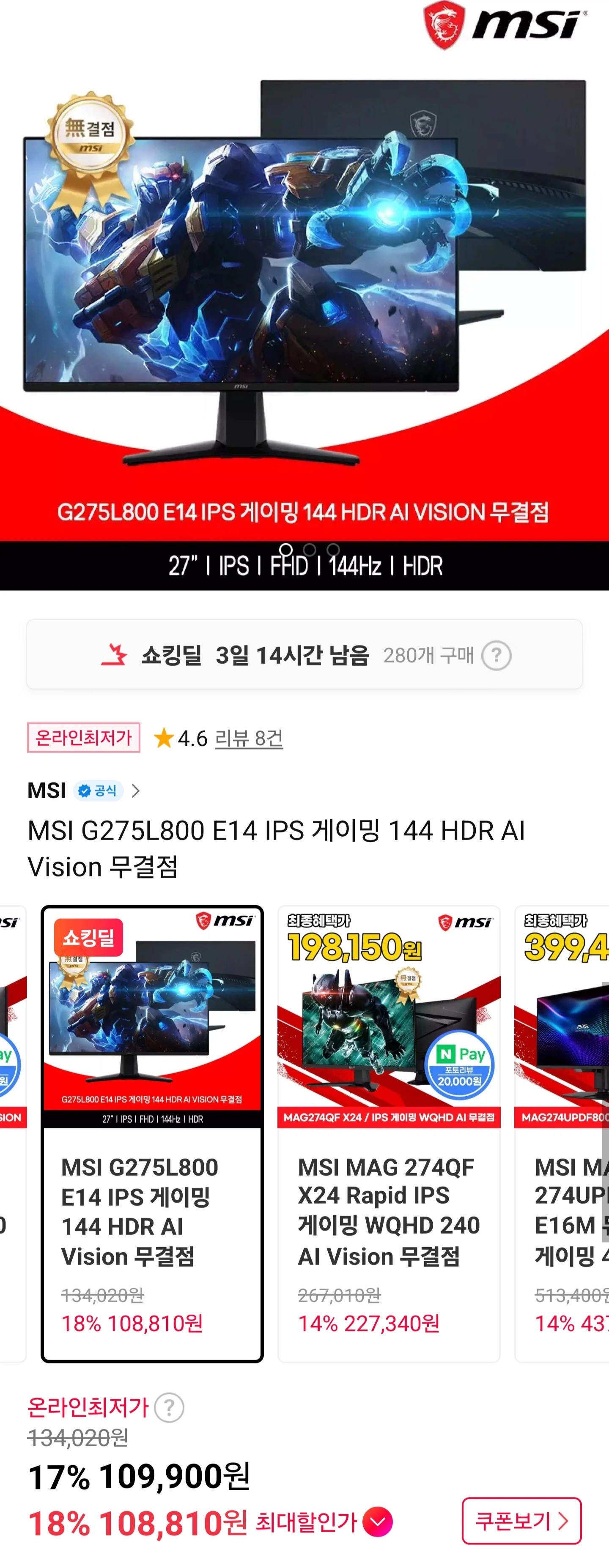 [11번가]MSI G275L800 E14 IPS 게이밍 모니터/109,9...