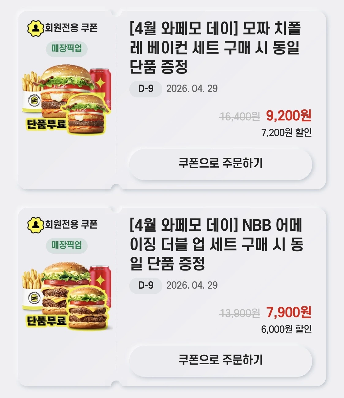 [노브랜드버거] 앱에서 7종 세트 구입시 단품 증정 (4/20~29)